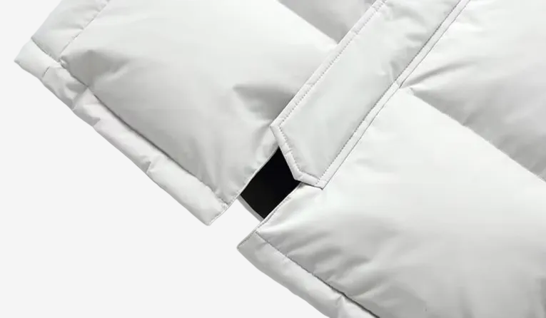 - Design: Long-length puffer jacket with hood, stand collar, front zip placket, and multiple pockets